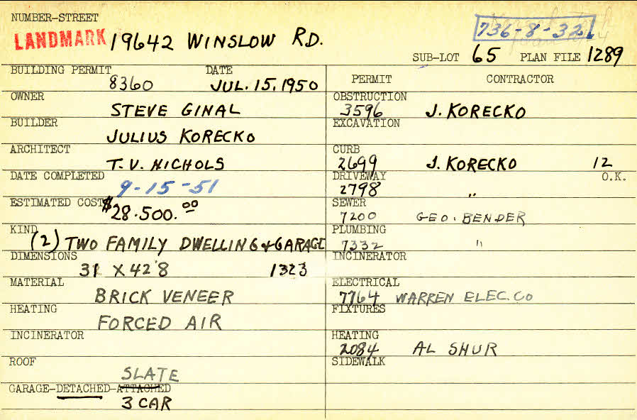 19642 Winslow Road Shaker Heights, OH 44122 PARCEL ID: 736-08-032 Building Permit Date: 07-15-1950 Plan File Number: 1289 all scanned Microfilm Roll: Roll015 Owner: Ginal, Steve Builder: Korecko, Julius Architect: Nichols, T. V. Estimated Cost: 28500 Date Completed: 09-15-1951 Kind: Duplex or Two-Family and Garage Material: Brick Veneer Heating: Forced Air Roof: Slate Garage: detached 3 car |