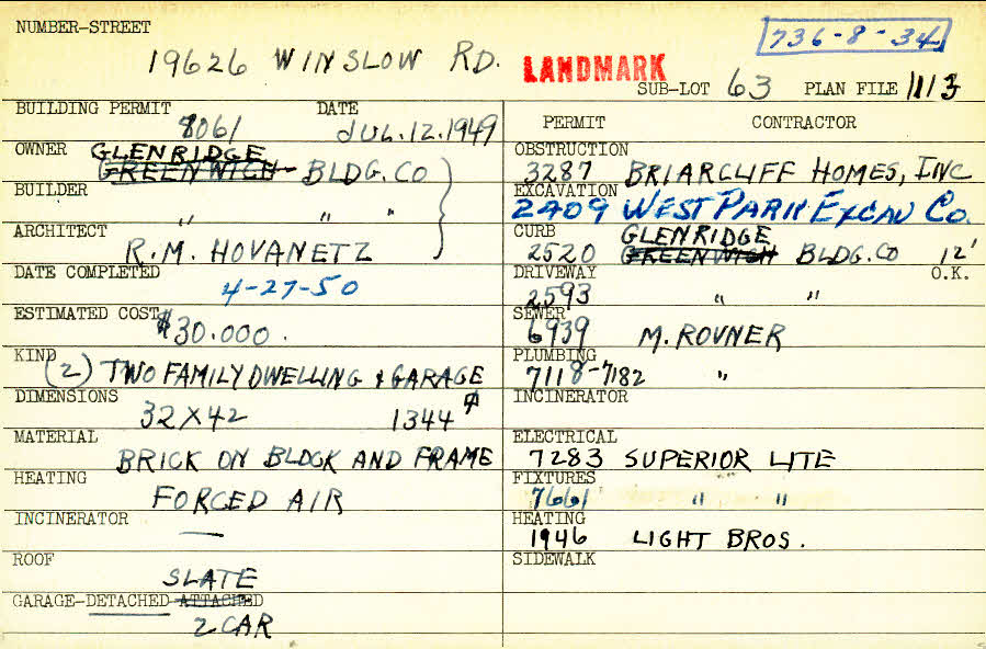 19626 Winslow Road Shaker Heights, OH 44122 PARCEL ID: 736-08-034 Building Permit Date: 07-12-1949 Plan File Number: 1113 all scanned Microfilm Roll: Roll013 Neighborhood: Sussex Owner: Glenridge Building Company Builder: Glenridge Building Company Architect: Hovanetz, R. M. Estimated Cost: 30000 Date Completed: 04-27-1950 Kind: Duplex or Two-Family and Garage Material: Brick on Block and Frame Heating: Forced Air Roof: Slate Garage: attached 2 car  |