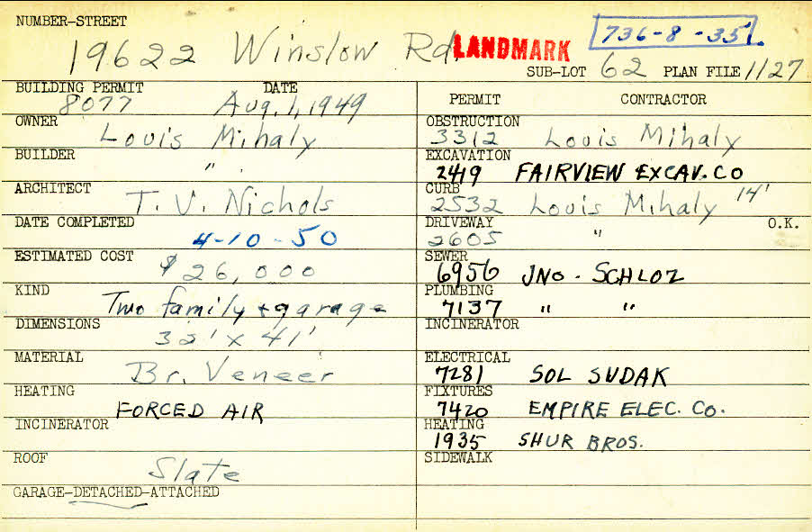 19622 Winslow Road Shaker Heights, OH 44122 PARCEL ID: 736-08-035 Building Permit Date: 08-01-1949 Plan File Number: 1127 all scanned Microfilm Roll: Roll013 Owner: Mihaly, Louis Builder: Mihaly, Louis Architect: Nichols, T. V. Estimated Cost: 26000 Date Completed: 04-10-1950 Kind: Duplex or Two-Family and Garage Material: Brick Veneer Heating: Forced Air Roof: Slate Garage: detached |