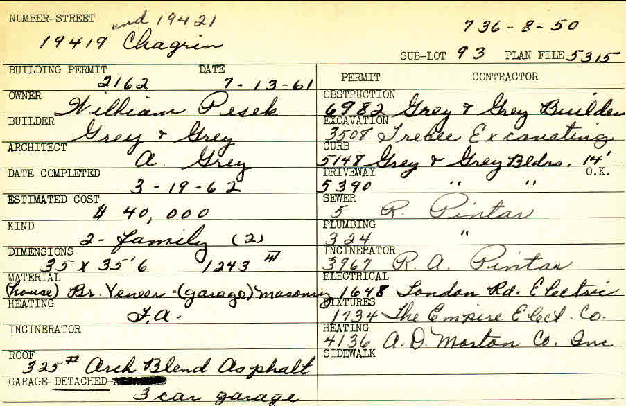 19419 Chagrin Boulevard Shaker Heights, OH 44122 PARCEL ID: 736-08-050 Building Permit Date: 07-13-1961 Plan File Number: 5315 Microfilm Roll: Roll#73 Neighborhood: Sussex Owner: Pesek, William Builder: Grey and Grey Architect: Grey, A. Estimated Cost: 40000 Date Completed: 03-19-1962 Kind: Duplex or Two-Family Material: Brick Veneer Heating: Forced Air Roof: 325# Asphalt Garage: detached 3 car |