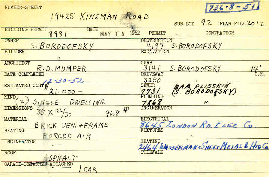 19425 Chagrin Boulevard Shaker Heights, OH 44122 PARCEL ID: 736-08-051 Building Permit Date: 05-15-1952 Plan File Number: 2012 Microfilm Roll: Roll#31 Neighborhood: Sussex Owner: Borodofsky, S. Builder: Borodofsky, S. Architect: Mumper, R. D. Estimated Cost: 21000 Date Completed: 12-30-1952 Kind: Single, Single Residence or Dwelling (2) Material: Brick Veneer and Frame Heating: Forced Air Roof: Asphalt Garage: attached |
