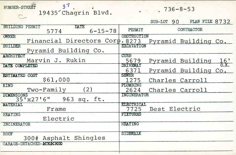 19435 Chagrin Boulevard Shaker Heights, OH 44122 PARCEL ID: 736-08-053 Building Permit Date: 06-15-1978 Plan File Number: 8732 Microfilm Roll: Roll#98 Neighborhood: Sussex Owner: Financial Directors Corporation Builder: Pyramid Building Company Architect: Rukin, Marvin J. Estimated Cost: 61000 Kind: Duplex or Two-Family Material: Frame Roof: 300# Min Asphalt Garage: detached |