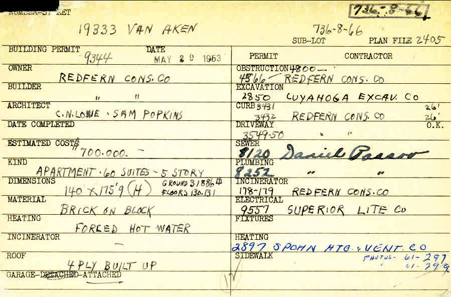 19333 Van Aken Boulevard Shaker Heights, OH 44120 PARCEL ID: 736-08-066 Building Permit Date: 05-29-1963 Plan File Number: 2058, 2405, 6020, 6648 all scanned Microfilm Roll: Roll031, Roll035, Roll080, Roll087 Neighborhood: Lomond Owner: Redfern Construction Company Builder: Redfern Construction Company Architect: Lowe, C. N. and Popkins, Sam Estimated Cost: 700000 Kind: Apartment or Multi-family (3+) Material: Brick on Block Heating: Hot Water Garage: attached Blueprints: online, see link above |
