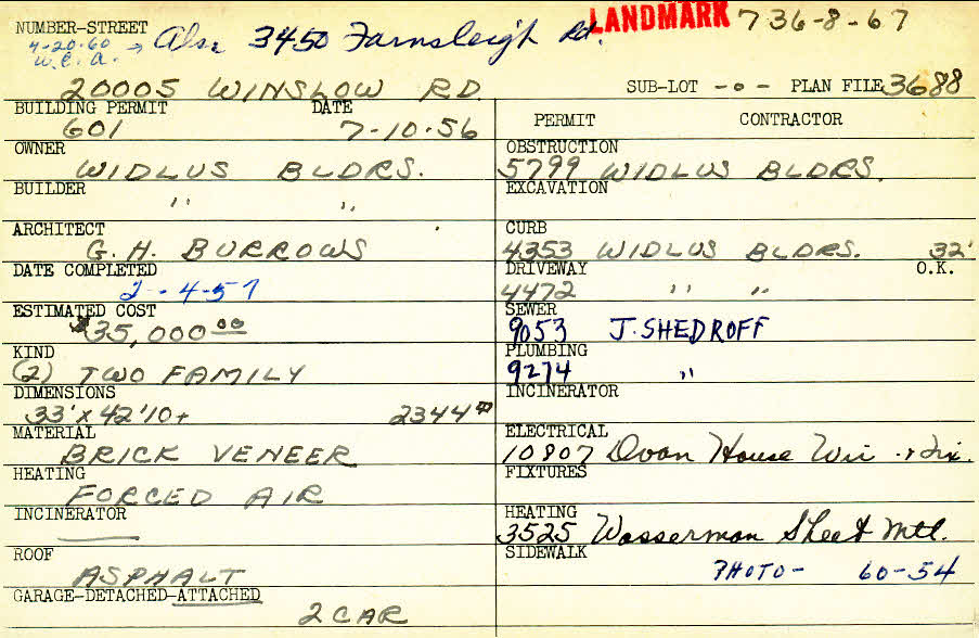 20005 Winslow Road Shaker Heights, OH 44122 PARCEL ID: 736-08-067 Building Permit Date: 07-10-1956 Plan File Number: 3688 Microfilm Roll: Roll#55 Neighborhood: Sussex Owner: Widlus Builders Builder: Widlus Builders Architect: Burrows, G. H. Estimated Cost: 35000 Date Completed: 02-04-1957 Kind: Duplex or Two-Family Material: Brick Veneer Heating: Forced Air Roof: Asphalt Garage: attached 2 car |