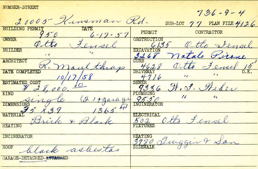 20005 Chagrin Boulevard Shaker Heights, OH 44122 PARCEL ID: 736-09-004 Building Permit Date: 06-17-1957 Plan File Number: 4126 Microfilm Roll: Roll#61 Neighborhood: Sussex Owner: Fensel, Otto Builder: Fensel, Otto Architect: Moulthrop, R. Estimated Cost: 28000 Date Completed: 10-17-1958 Kind: Single Dwelling and Garage (2) Material: Brick and Block Roof: Asbestos Garage: detached |