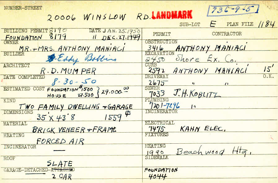 20006 Winslow Road Shaker Heights, OH 44122 PARCEL ID: 736-09-005 Building Permit Date: 12-27-1949 Plan File Number: 1184, 2482 all scanned Microfilm Roll: Roll014, Roll035 Neighborhood: Sussex Owner: Maniaci, Mr. and Mrs. Anthony Builder: Bobbins, Eddy Architect: Mumper, R. D. Estimated Cost: 29000 Date Completed: 08-30-1950 Kind: Duplex or Two-Family and Garage Material: Brick Veneer and Frame Heating: Forced Air Roof: Slate Garage: detached 2 car Blueprints: online, see link above |
