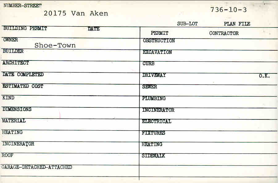 20175 - 20321 Van Aken Boulevard The Van Aken Shopping Center / Moreland Center Shaker Heights, OH 44120 PARCEL ID: 736-10-003 Digitized blueprints -- a partial set so far Building Permit Date: 12-14-1951 Plan File Number: 1831 scanned, 2238, 2597, 3825, 4993, 5104, 5173, 6275, 7164, 7374, 9938, 12935 scanned, 12966 scanned, 13031 scanned Microfilm Roll: Roll027, Roll#33, Roll #36, Roll#56, Roll#68, Roll#70, Roll#84, Roll#91, Roll#92, Roll#105, NewRoll19 Neighborhood: Lomond Owner: The Moreland Center Co. Builder: Zehman Wolf Construction Co. Architect: Weinberg & Teare Estimated Cost: 300000 Date Completed: 05-28-1953 Kind: Commercial - Retail or Office Material: Brick on Block Heating: Gas Unit Heater Roof: Slate Card Available: Yes Blueprints: online, see link above |