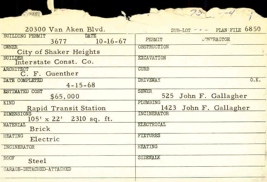 20300 Van Aken Boulevard Rapid Transit Station Shaker Heights, OH 44120 PARCEL ID: 736-10-004 Building Permit Date: 10-16-1967 Plan File Number: 6850 all scanned Microfilm Roll: Roll088 Neighborhood: Lomond Owner: City of Shaker Heights Builder: Interstate Construction Company Architect: Guenther, C. F. Estimated Cost: 65000 Date Completed: 04-15-1968 Kind: Government and Municipal (incl. Schools) Material: Brick |