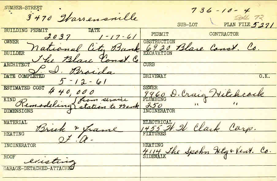 3470 Warrensville Center Road Shaker Heights, OH 44122 PARCEL ID: 736-10-004 Building Permit Date: 01-17-1961 Plan File Number: 5271, 10123, 10168, 10541, 10542, 12447, 12927 scanned Microfilm Roll: Roll#72, NewRoll#2, NewRoll#4, NewRoll#13, NewRoll19 Neighborhood: Sussex Owner: National City Bank Builder: The Blase Construction Company Architect: Broida, L. I. Estimated Cost: 40000 Date Completed: 05-12-1961 Material: Brick and Frame Heating: Forced Air |