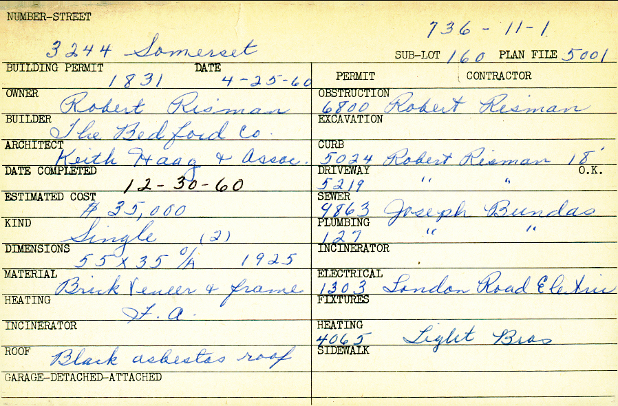 3244 Somerset Drive Shaker Heights, OH 44122 PARCEL ID: 736-11-001 Building Permit Date: 04-25-1960 Plan File Number: 5001 Microfilm Roll: Roll#68 Neighborhood: Mercer Owner: Risman, Robert Builder: The Bedford Company Architect: Keith Haag and Associates Estimated Cost: 35000 Date Completed: 12-30-1960 Kind: Single, Single Residence or Dwelling (2) Material: Brick Veneer and Frame Heating: Forced Air Roof: Asbestos |