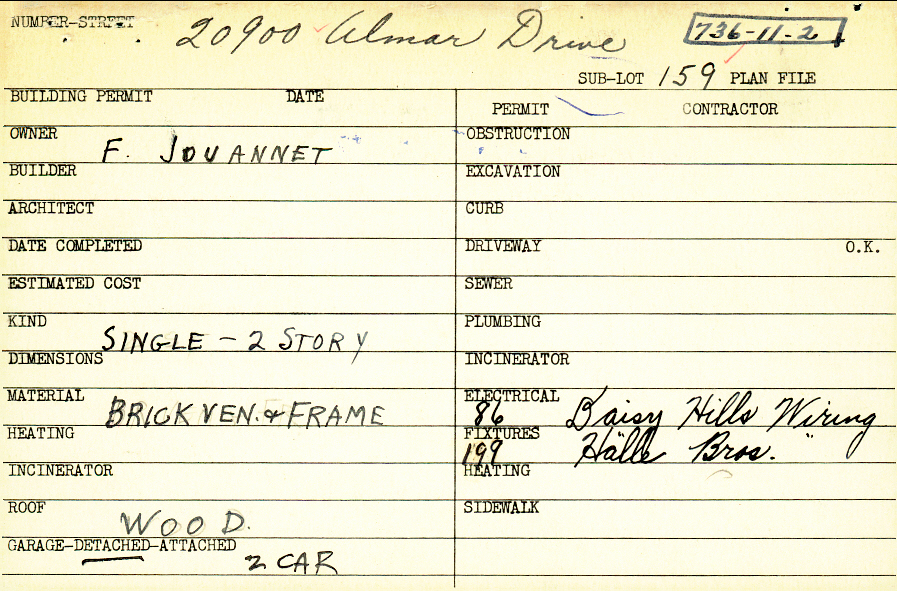20900 Almar Drive Shaker Heights, OH 44122 PARCEL ID: 736-11-002 Plan File Number: 2193, 3127 Microfilm Roll: Roll#33, Roll#44 Neighborhood: Mercer Owner: Jouannet, F. Kind: Single, Single Residence or Dwelling (2) Material: Brick Veneer and Frame Roof: Wood Garage: detached 2 car |