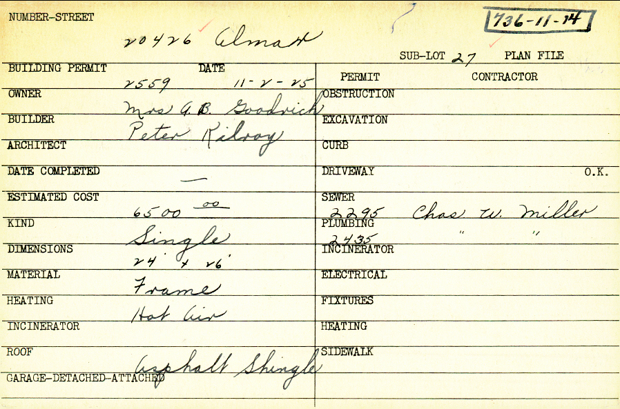20426 Almar Drive Shaker Heights, OH 44122 PARCEL ID: 736-11-014 Building Permit Date: 11-02-1925 Plan File Number: 2214, 5185 Microfilm Roll: Roll#33, Roll#70 Neighborhood: Mercer Owner: Goodrich, Mrs. A. B. Builder: Kilroy, Peter Estimated Cost: 6500 Kind: Single, Single Residence or Dwelling Material: Frame Heating: Hot Air Roof: Asphalt Shingles |