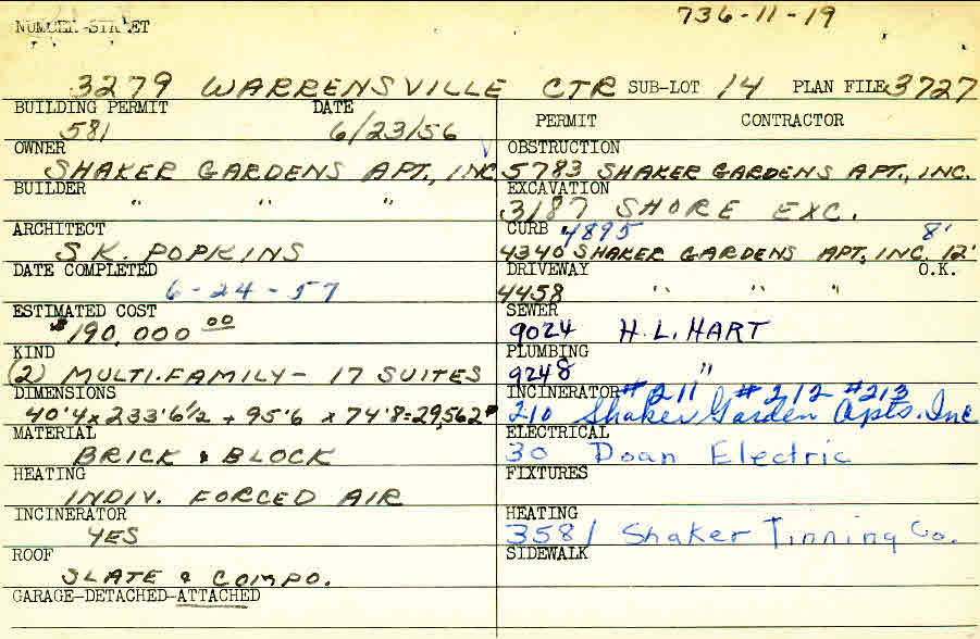 3279 Warrensville Center Road Shaker Heights, OH 44122 PARCEL ID: 736-11-019 Building Permit Date: 06-23-1956 Plan File Number: 3727, 7768 Microfilm Roll: Roll#51, Roll#94 Neighborhood: Malvern Owner: Shaker Gardens Apartments, Inc. Builder: Shaker Gardens Apartments, Inc. Architect: Popkins, S. K. Estimated Cost: 190000 Date Completed: 06-24-1957 Kind: Apartment or Multi-family (3+) Material: Brick and Block Heating: Forced Air Roof: Slate Garage: attached |