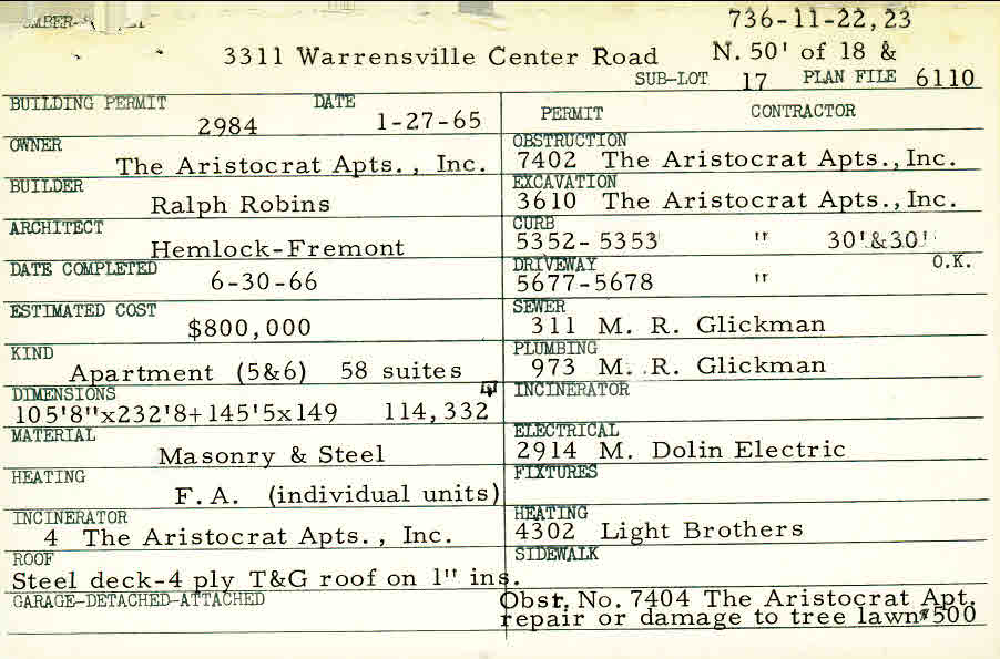 3311 Warrensville Center Road Shaker Heights, OH 44122 PARCEL ID: 736-11-022 Building Permit Date: 01-27-1965 Plan File Number: 4914, 6110, 6386 Microfilm Roll: Roll#68, Roll#83, Roll#85 Neighborhood: Malvern Owner: The Aristocrat Apartments, Inc. Builder: Robins, Ralph Architect: Hemlock - Freemont Estimated Cost: 800000 Date Completed: 06-30-1966 Kind: Apartment or Multi-family (3+) Material: Masonry and Steel Heating: Forced Air |