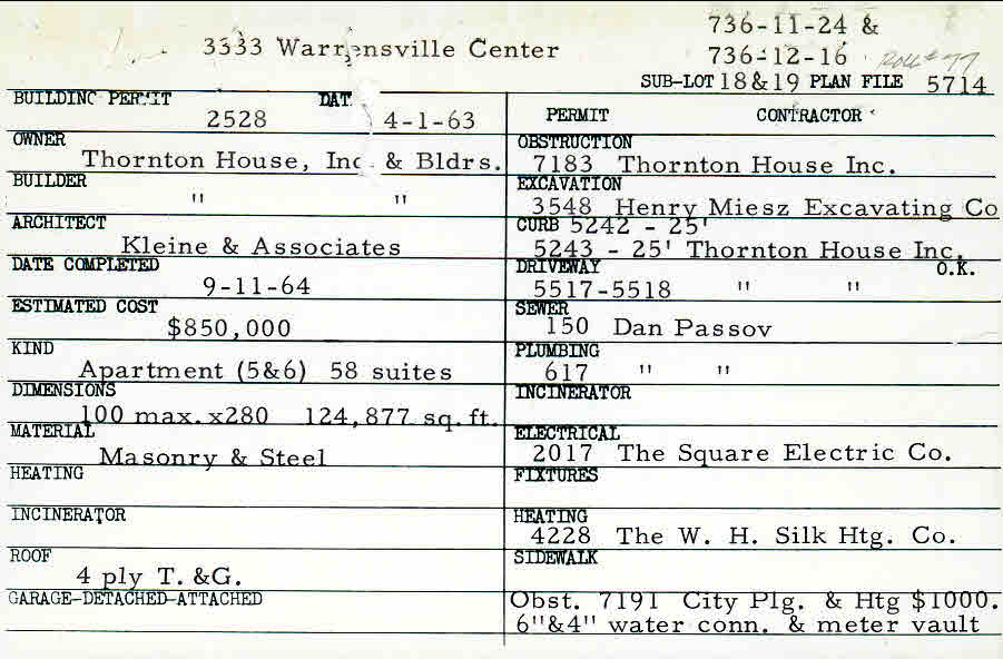 3333 Warrensville Center Road Shaker Heights, OH 44122 PARCEL ID: 736-11-024 Building Permit Date: 04-01-1963 Plan File Number: 5714 all scanned Microfilm Roll: Roll077 Neighborhood: Malvern Owner: Thornton House, Inc. and Builders Builder: Thornton House, Inc. and Builders Architect: Kleine and Associates Estimated Cost: 850000 Date Completed: 09-11-1964 Kind: Apartment or Multi-family (3+) Material: Masonry and Steel |