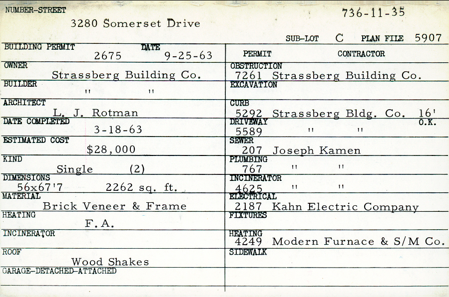 3280 Somerset Drive Shaker Heights, OH 44122 PARCEL ID: 736-11-035 Building Permit Date: 09-25-1963 Plan File Number: 5907 Microfilm Roll: Roll#80 Neighborhood: Mercer Owner: Strassberg Building Company Builder: Strassberg Building Company Architect: Rotman, L. J. Estimated Cost: 28000 Date Completed: 03-18-1963 Kind: Single, Single Residence or Dwelling (2) Material: Brick Veneer and Frame Heating: Forced Air Roof: Wood Shakes |