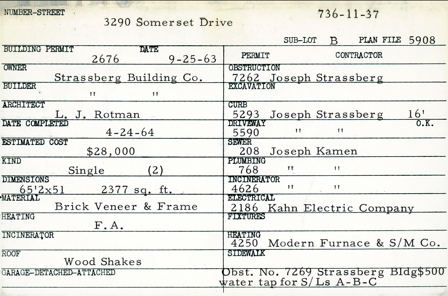 3290 Somerset Drive Shaker Heights, OH 44122 PARCEL ID: 736-11-037 Building Permit Date: 09-25-1963 Plan File Number: 5908 Microfilm Roll: Roll#80 Neighborhood: Mercer Owner: Strassberg Building Company Builder: Strassberg Building Company Architect: Rotman, L. J. Estimated Cost: 28000 Date Completed: 04-24-1964 Kind: Single, Single Residence or Dwelling (2) Material: Brick Veneer and Frame Heating: Forced Air Roof: Wood Shakes |