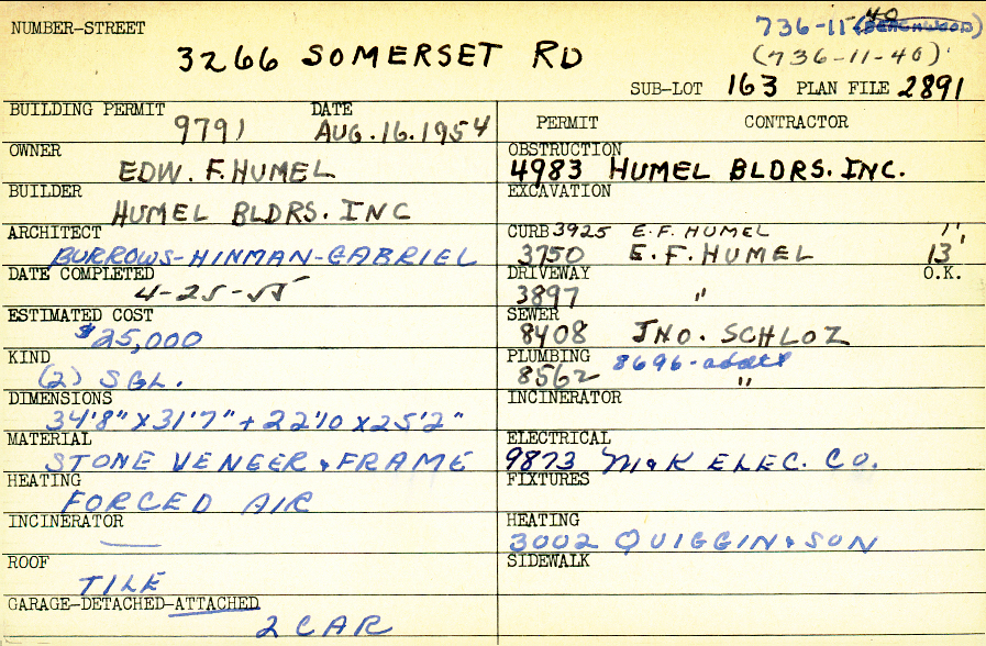 3266 Somerset Drive Shaker Heights, OH 44122 PARCEL ID: 736-11-040 Building Permit Date: 08-16-1954 Plan File Number: 2891 all scanned Microfilm Roll: Roll041 Owner: Humel, Edward F. Builder: Humel Builders Inc. Architect: Burrows, Hinman, Gabriel Estimated Cost: 25000 Date Completed: 04-25-1955 Kind: Single, Single Residence or Dwelling (2) Material: Stone Veneer and Frame Heating: Forced Air Roof: Tile Garage: attached 2 car |