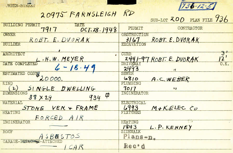 20975 Farnsleigh Road Shaker Heights, OH 44122 PARCEL ID: 736-12-005 Building Permit Date: 10-28-1948 Plan File Number: 936 Neighborhood: Mercer Owner: Dvorak, Robert E. Builder: Dvorak, Robert E. Architect: Meyer, L. H. W. Estimated Cost: 20000 Date Completed: 06-18-1949 Kind: Single, Single Residence or Dwelling (2) Material: Stone Veneer and Frame Heating: Forced Air Roof: Asbestos Garage: attached Card Available: yes |