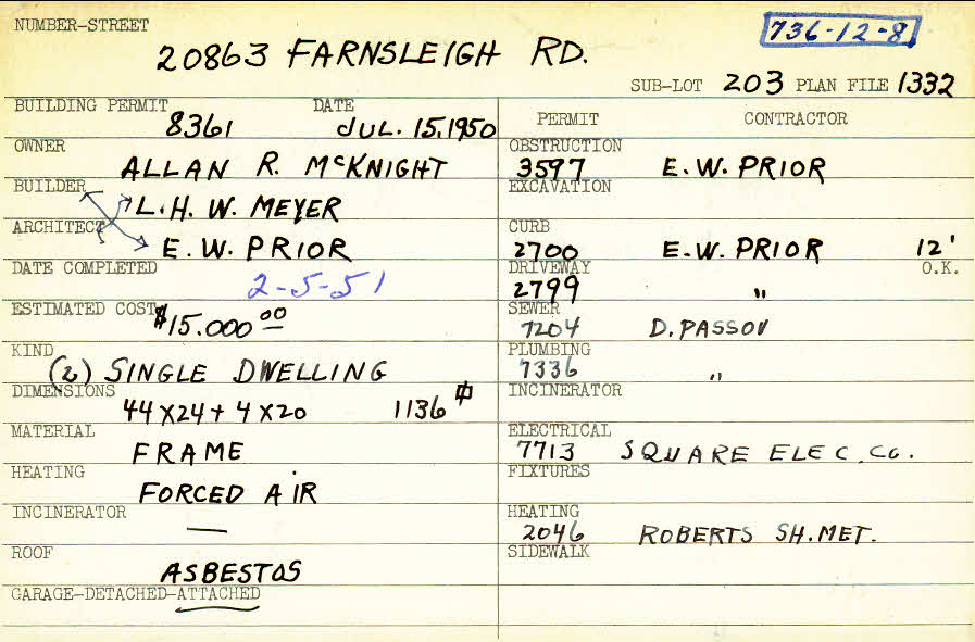 20863 Farnsleigh Road Shaker Heights, OH 44122 PARCEL ID: 736-12-008 Building Permit Date: 07-15-1950 Plan File Number: 1332 all scanned Microfilm Roll: Roll015 Neighborhood: Mercer Owner: McKnight, Allan R. Builder: Prior, E. W. Architect: Meyer, L. H. W. Estimated Cost: 15000 Date Completed: 02-05-1951 Kind: Single, Single Residence or Dwelling (2) Material: Frame Heating: Forced Air Roof: Asbestos Garage: attached Blueprints: online, see link above |