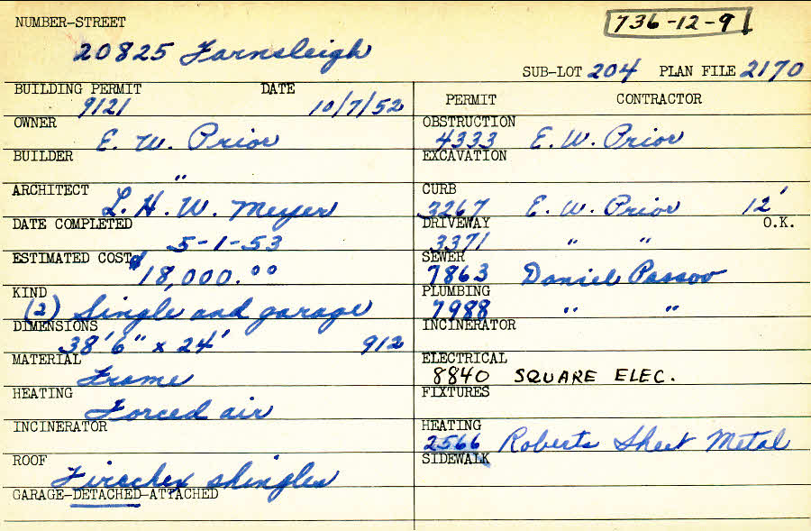 20825 Farnsleigh Road Shaker Heights, OH 44122 PARCEL ID: 736-12-009 Building Permit Date: 10-07-1952 Plan File Number: 2170 Microfilm Roll: Roll#33 Neighborhood: Mercer Owner: Prior, E. W. Builder: Prior, E. W. Architect: Meyer, L. H. W. Estimated Cost: 18000 Date Completed: 05-01-1953 Kind: Single Dwelling and Garage (2) Material: Frame Heating: Forced Air Roof: Asphalt Garage: detached |