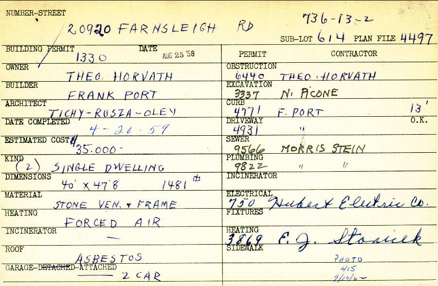 20920 Farnsleigh Road Shaker Heights, OH 44122 PARCEL ID: 736-13-002 Building Permit Date: 08-25-1958 Plan File Number: 4497, 5461, 5677 Microfilm Roll: Roll#63, Roll#74, Roll#77 Neighborhood: Mercer Owner: Horvath, Theodore Builder: Port, Frank Architect: Tichy - Rusza - Oley Estimated Cost: 35000 Date Completed: 04-20-1959 Kind: Single, Single Residence or Dwelling (2) Material: Stone Veneer and Frame Heating: Forced Air Roof: Asbestos Garage: attached 2 car |