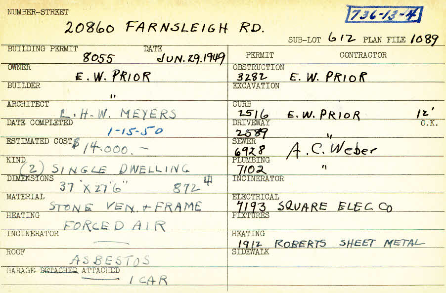 20860 Farnsleigh Road Shaker Heights, OH 44122 PARCEL ID: 736-13-004 Building Permit Date: 06-29-1949 Plan File Number: 1089 scanned, 5524, 5733 Microfilm Roll: Roll013, Roll#75, Roll#77 Neighborhood: Mercer Owner: Prior, E. W. Builder: Prior, E. W. Architect: Meyers, L. H. W. Estimated Cost: 14000 Date Completed: 01-15-1950 Kind: Single, Single Residence or Dwelling (2) Material: Stone Veneer and Frame Heating: Forced Air Roof: Asbestos Garage: attached |