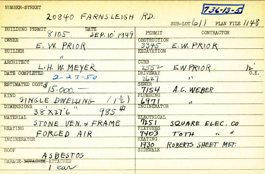 20840 Farnsleigh Road Shaker Heights, OH 44122 PARCEL ID: 736-13-005 Building Permit Date: 09-10-1949 Plan File Number: 1148 all scanned Microfilm Roll: Roll014 Neighborhood: Mercer Owner: Prior, E. W. Builder: Prior, E. W. Architect: Meyer, L. H. W. Estimated Cost: 15000 Date Completed: 02-23-1950 Kind: Single, Single Residence or Dwelling Material: Stone Veneer and Frame Heating: Forced Air Roof: Asbestos Garage: attached |