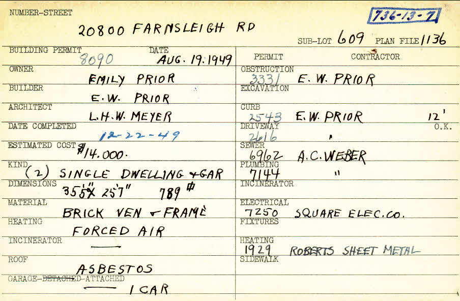 20800 Farnsleigh Road Shaker Heights, OH 44122 PARCEL ID: 736-13-007 Building Permit Date: 08-19-1949 Plan File Number: 1136 scanned, 2246, 5884 Microfilm Roll: Roll013, Roll#34, Roll#79 Neighborhood: Mercer Owner: Prior, Emily Builder: Prior, E. W. Architect: Meyer, L. H. W. Estimated Cost: 14000 Date Completed: 12-22-1949 Kind: Single Dwelling and Garage (2) Material: Brick Veneer and Frame Heating: Forced Air Roof: Asbestos Garage: attached |