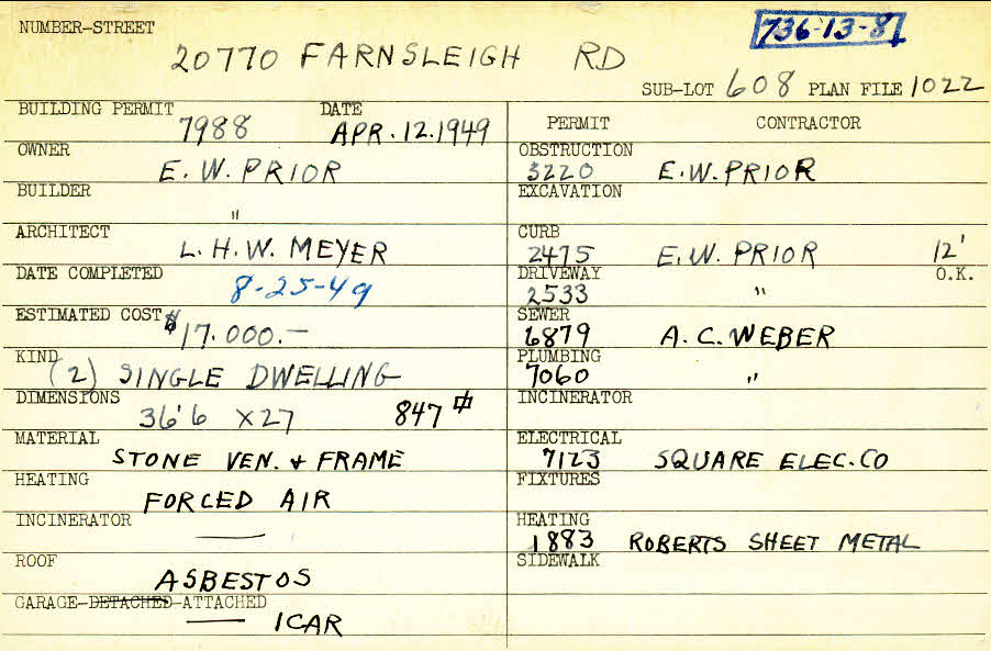 20770 Farnsleigh Road Shaker Heights, OH 44122 PARCEL ID: 736-13-008 Building Permit Date: 04-12-1949 Plan File Number: 1022 all scanned Microfilm Roll: Roll013 Neighborhood: Mercer Owner: Prior, E. W. Builder: Prior, E. W. Architect: Meyer, L. H. W. Estimated Cost: 17000 Date Completed: 08-25-1949 Kind: Single, Single Residence or Dwelling (2) Material: Stone Veneer and Frame Heating: Forced Air Roof: Asbestos Garage: attached |