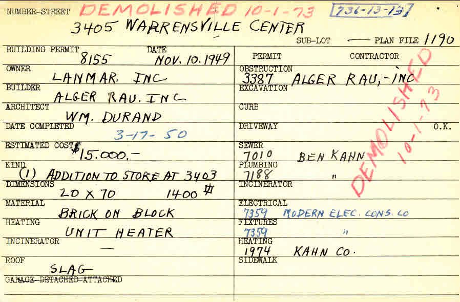 3405 Warrensville Center Road Shaker Heights, OH 44122 PARCEL ID: 736-13-013 Building Permit Date: 11-10-1949 Plan File Number: 1190 scanned, 10316, 10397 Microfilm Roll: Roll014, NewRoll#3 Neighborhood: Sussex Owner: Lanmar, Inc. Builder: Alger Rau, Inc. Architect: Durand, William Estimated Cost: 15000 Date Completed: 03-17-1950 Material: Brick on Block |