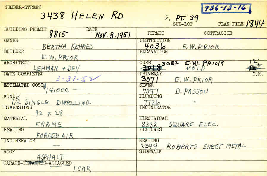 3438 Helen Road Shaker Heights, OH 44122 PARCEL ID: 736-13-016 Building Permit Date: 11-03-1951 Plan File Number: 1844 all scanned Microfilm Roll: Roll028 Neighborhood: Mercer Owner: Kehres, Bertha Builder: Prior, E. W. Architect: Lehman and Dey Estimated Cost: 14000 Date Completed: 03-31-1952 Kind: Single, Single Residence or Dwelling Material: Frame Heating: Forced Air Roof: Asphalt Garage: attached Card Available: Yes Blueprints: online, see link above |