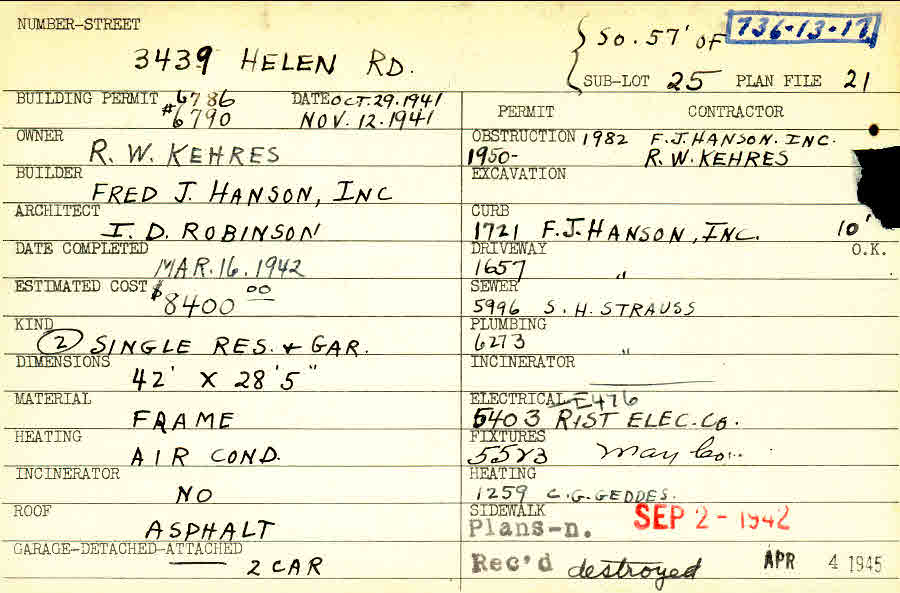 3439 Helen Road Shaker Heights, OH 44122 PARCEL ID: 736-13-017 Building Permit Date: 10-29-1941 Plan File Number: 21 Neighborhood: Mercer Owner: Kehres, R. W. Builder: Fred J. Hanson, Inc. Architect: Robinson, I. D. Estimated Cost: 8400 Date Completed: 03-16-1942 Kind: Single Dwelling and Garage (2) Material: Frame Heating: Air Conditioned Roof: Asphalt Garage: attached 2 car |