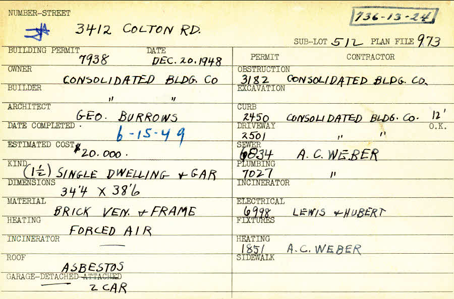 3412 Colton Road Shaker Heights, OH 44122 PARCEL ID: 736-13-024 Building Permit Date: 12-20-1948 Plan File Number: 973 all scanned Microfilm Roll: Roll012 Neighborhood: Mercer Owner: Consolidated Building Company Builder: Consolidated Building Company Architect: Burrows, George Estimated Cost: 20000 Date Completed: 06-15-1949 Kind: Single Dwelling and Garage Material: Brick Veneer and Frame Heating: Forced Air Roof: Asbestos Garage: detached 2 car |