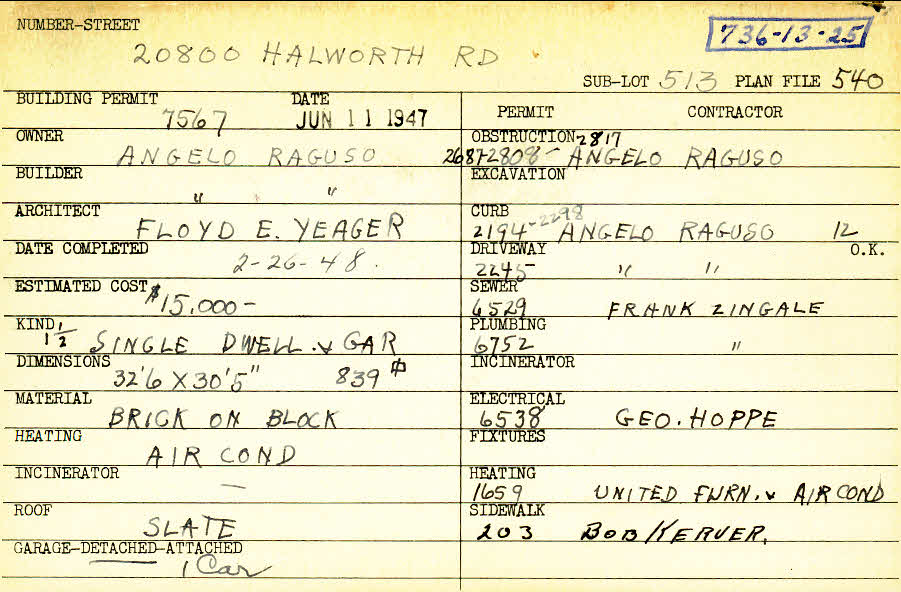 20800 Halworth Road Shaker Heights, OH 44122 PARCEL ID: 736-13-025 Building Permit Date: 06-11-1947 Plan File Number: 540 all scanned Microfilm Roll: Roll007 Neighborhood: Mercer Owner: Raguso, Angelo Builder: Raguso, Angelo Architect: Yeager, Floyd E. Estimated Cost: 15000 Date Completed: 02-26-1948 Kind: Single Dwelling and Garage Material: Brick on Block Heating: Air Conditioned Roof: Slate Garage: detached |