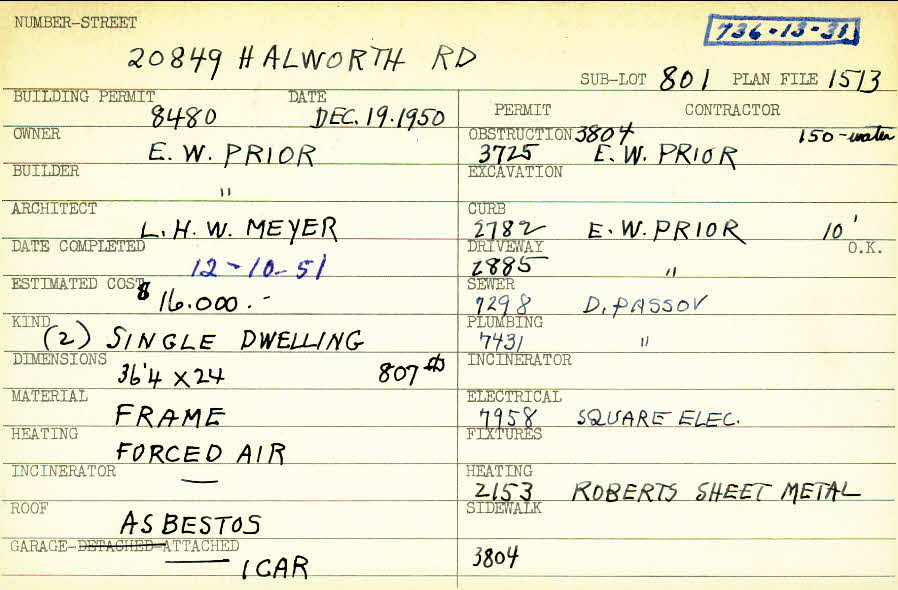 20849 Halworth Road Shaker Heights, OH 44122 PARCEL ID: 736-13-031 Building Permit Date: 12-19-1950 Plan File Number: 1513, 10150 all scanned Microfilm Roll: Roll024, NewRoll02 Neighborhood: Mercer Owner: Prior, E. W. Builder: Prior, E. W. Architect: Meyer, L. H. W. Estimated Cost: 16000 Date Completed: 12-10-1951 Kind: Single, Single Residence or Dwelling (2) Material: Frame Heating: Forced Air Roof: Asbestos Garage: attached Blueprints: online, see link above |
