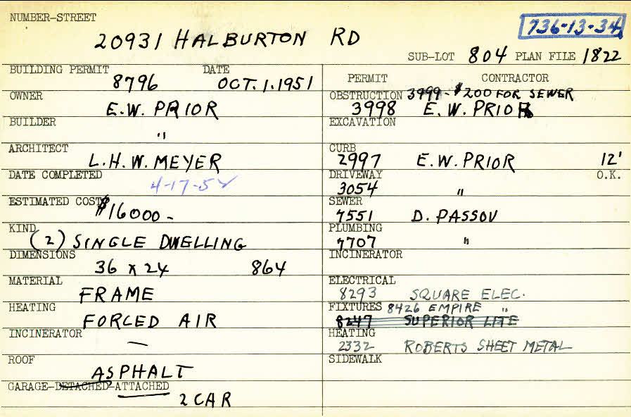 20931 Halburton Road Shaker Heights, OH 44122 PARCEL ID: 736-13-034 Building Permit Date: 10-01-1951 Plan File Number: 1822 all scanned Microfilm Roll: Roll027 Neighborhood: Mercer Owner: Prior, E.W. Builder: Prior, E.W. Architect: Meyer, L.H.W. Estimated Cost: 16000 Date Completed: 04-17-1952 Kind: Single, Single Residence or Dwelling (2) Material: Frame Heating: Forced Air Roof: Asphalt Garage: attached 2 car |