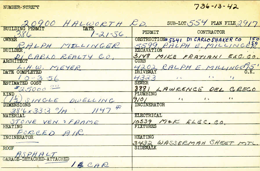 20900 Halworth Road Shaker Heights, OH 44122 PARCEL ID: 736-13-042 Building Permit Date: 01-21-1956 Plan File Number: 2917 all scanned Microfilm Roll: Roll041 Neighborhood: Mercer Owner: Mellinger, Ralph Builder: DiCarlo Realty Company Architect: Meyer, L. H. W. Estimated Cost: 25000 Date Completed: 10-03-1956 Kind: Single, Single Residence or Dwelling Material: Stone Veneer and Frame Heating: Forced Air Roof: Asphalt Garage: attached |