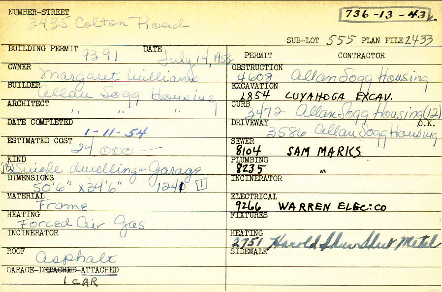 3435 Colton Road Shaker Heights, OH 44122 PARCEL ID: 736-13-043 Building Permit Date: 07-14-1953 Plan File Number: 2433 all scanned Microfilm Roll: Roll035 Neighborhood: Mercer Owner: Williams, Margaret Builder: Allen Sogg Housing Corporation Architect: Allen Sogg Housing Corporation Estimated Cost: 24000 Date Completed: 01-11-1954 Kind: Single Dwelling and Garage Material: Frame Heating: Forced Air - Gas Roof: Asphalt Garage: attached |