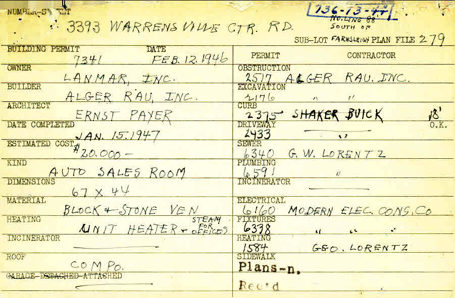 3393 Warrensville Center Road Shaker Heights, OH 44122 PARCEL ID: 736-13-044 Building Permit Date: 02-12-1946 Plan File Number: 279, 803, 1019, 1775 all scanned Microfilm Roll: Roll003, Roll011, Roll013, Roll027 Neighborhood: Sussex Owner: Lanmar, Inc. Builder: Alger Rau, Inc. Architect: Payer, Ernst Estimated Cost: 20000 Date Completed: 01-15-1947 Kind: Commercial - Retail or Office Material: Block and Stone Veneer Heating: Steam Roof: Composition & Shingles Card Available: Yes |  |