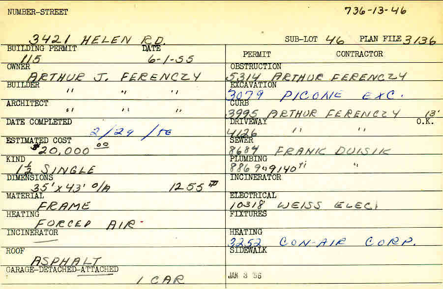 3421 Helen Road Shaker Heights, OH 44122 PARCEL ID: 736-13-046 Building Permit Date: 06-01-1955 Plan File Number: 3136 Microfilm Roll: Roll#44 Neighborhood: Mercer Owner: Ferenczy, Arthur J. Builder: Ferenczy, Arthur J. Architect: Ferenczy, Arthur J. Estimated Cost: 20000 Date Completed: 02-29-1956 Kind: Single, Single Residence or Dwelling Material: Frame Heating: Forced Air Roof: Asphalt Garage: attached |