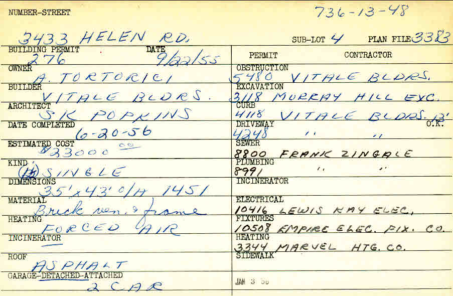 3433 Helen Road Shaker Heights, OH 44122 PARCEL ID: 736-13-048 Building Permit Date: 09-22-1955 Plan File Number: 3383, 3895 Microfilm Roll: Roll#49, Roll#57 Neighborhood: Mercer Owner: Tortorici, A. Builder: Vitale Builders Architect: Popkins, S. K. Estimated Cost: 23000 Date Completed: 06-20-1956 Kind: Single, Single Residence or Dwelling Material: Brick Veneer and Frame Heating: Forced Air Roof: Asphalt Garage: attached 2 car |