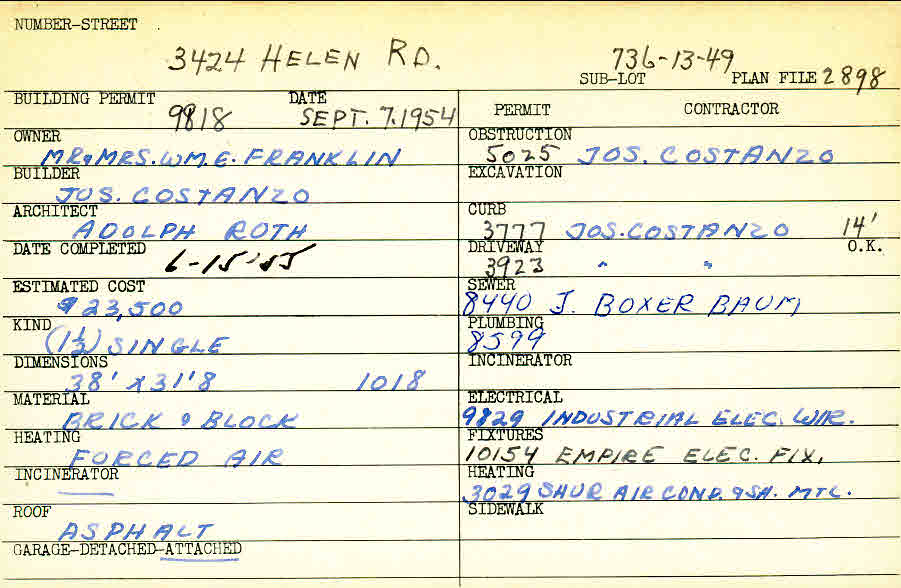 3424 Helen Road Shaker Heights, OH 44122 PARCEL ID: 736-13-049 Building Permit Date: 09-07-1954 Plan File Number: 2898 all scanned, 10730 Microfilm Roll: Roll041, NewRoll#5 Neighborhood: Mercer Owner: Franklin, William E. Mr. and Mrs. Builder: Costanzo, Joseph Architect: Roth, Adolph Estimated Cost: 23500 Date Completed: 06-15-1955 Kind: Single, Single Residence or Dwelling Material: Brick and Block Heating: Forced Air Roof: Asphalt Garage: attached |