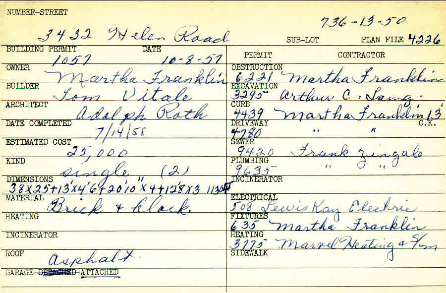 3432 Helen Road Shaker Heights, OH 44122 PARCEL ID: 736-13-050 Building Permit Date: 10-08-1957 Plan File Number: 4226 Microfilm Roll: Roll#61 Neighborhood: Mercer Owner: Franklin, Martha Builder: Vitale, Tom Architect: Roth, Adolph Estimated Cost: 25000 Date Completed: 07-14-1958 Kind: Single, Single Residence or Dwelling (2) Material: Brick and Block Roof: Asphalt Garage: attached |