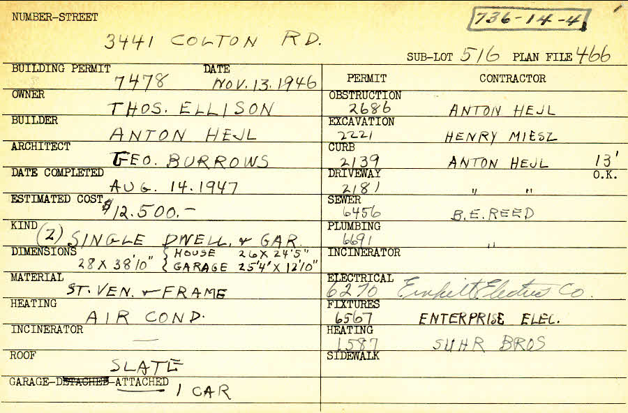 3441 Colton Road Shaker Heights, OH 44122 PARCEL ID: 736-14-004 Building Permit Date: 11-13-1946 Plan File Number: 466 all scanned Microfilm Roll: Roll004 Neighborhood: Mercer Owner: Ellison, Thomas Builder: Hejl, Anton Architect: Burrows, George Estimated Cost: 12500 Date Completed: 08-14-1947 Kind: Single Dwelling and Garage (2) Material: Stone Veneer and Frame Heating: Air Conditioned Roof: Slate Garage: attached |