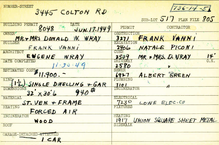 3445 Colton Road Shaker Heights, OH 44122 PARCEL ID: 736-14-005 Building Permit Date: 06-17-1949 Plan File Number: 805 all scanned Microfilm Roll: Roll011 Neighborhood: Mercer Owner: Wray, Mr. and Mrs. Donald W. Builder: Vanni, Frank Architect: Wray, Eugene Estimated Cost: 11900 Date Completed: 11-30-1949 Kind: Single Dwelling and Garage Material: Stone Veneer and Frame Heating: Forced Air Garage: detached |
