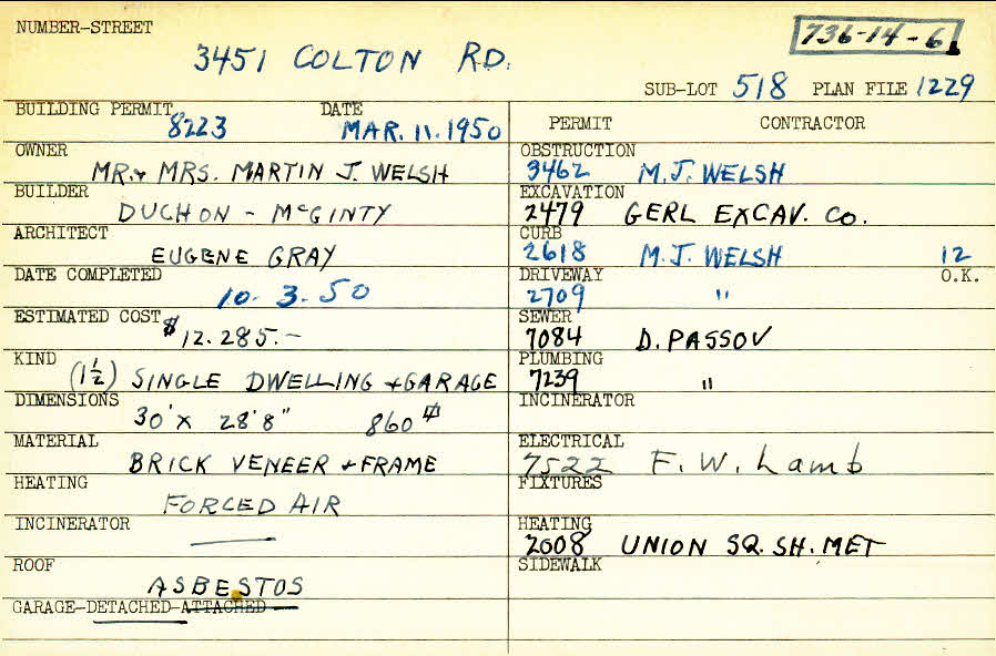 3451 Colton Road Shaker Heights, OH 44122 PARCEL ID: 736-14-006 Building Permit Date: 03-11-1950 Plan File Number: 1229 scanned, 10372, 10554 Microfilm Roll: Roll014, NewRoll#3, NewRoll#4 Neighborhood: Mercer Owner: Welsh, Mr. and Mrs. Martin J. Builder: Duchon-McGinty Architect: Gray, Eugene Estimated Cost: 12285 Date Completed: 10-03-1950 Kind: Single Dwelling and Garage Material: Brick Veneer and Frame Heating: Forced Air Roof: Asbestos Garage: detached |