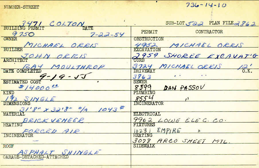 3471 Colton Road Shaker Heights, OH 44122 PARCEL ID: 736-14-010 Building Permit Date: 07-22-1954 Plan File Number: 2862 all scanned Microfilm Roll: Roll041 Neighborhood: Mercer Owner: Orris, Michael Builder: Orris, John Architect: Moulthrop, Ray Estimated Cost: 14000 Date Completed: 09-19-1955 Kind: Single, Single Residence or Dwelling Material: Brick Veneer Heating: Forced Air Roof: Asphalt Shingles Garage: detached |