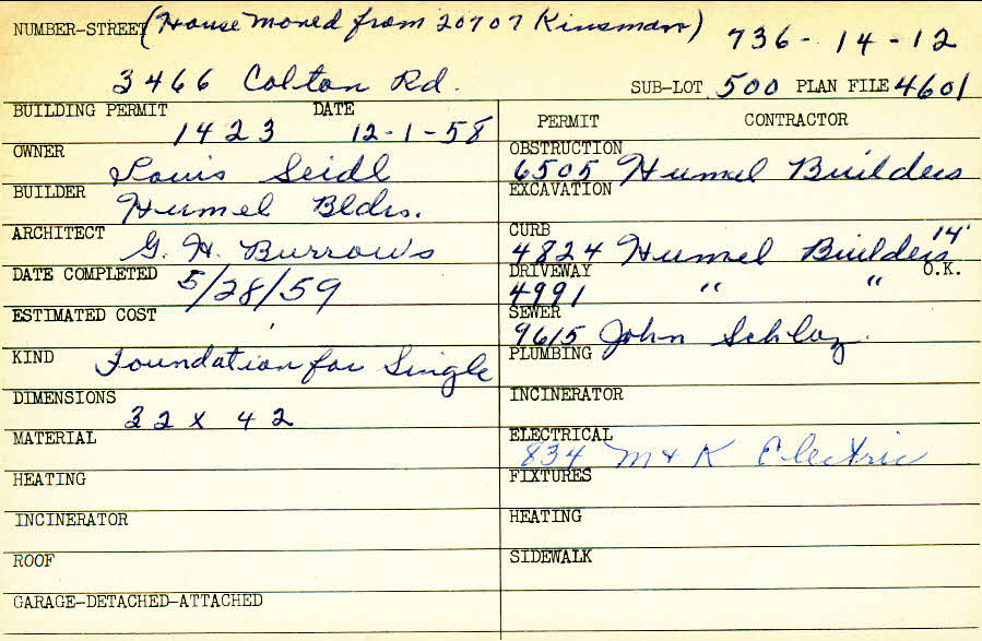 3466 Colton Road Shaker Heights, OH 44122 PARCEL ID: 736-14-012 Building Permit Date: 12-01-1958 Plan File Number: 4601 Microfilm Roll: Roll#65 Neighborhood: Mercer Owner: Seidl, Louis Builder: Humel Builders Architect: Burrows, George H. Date Completed: 05-28-1959 Kind: Single, Single Residence or Dwelling |