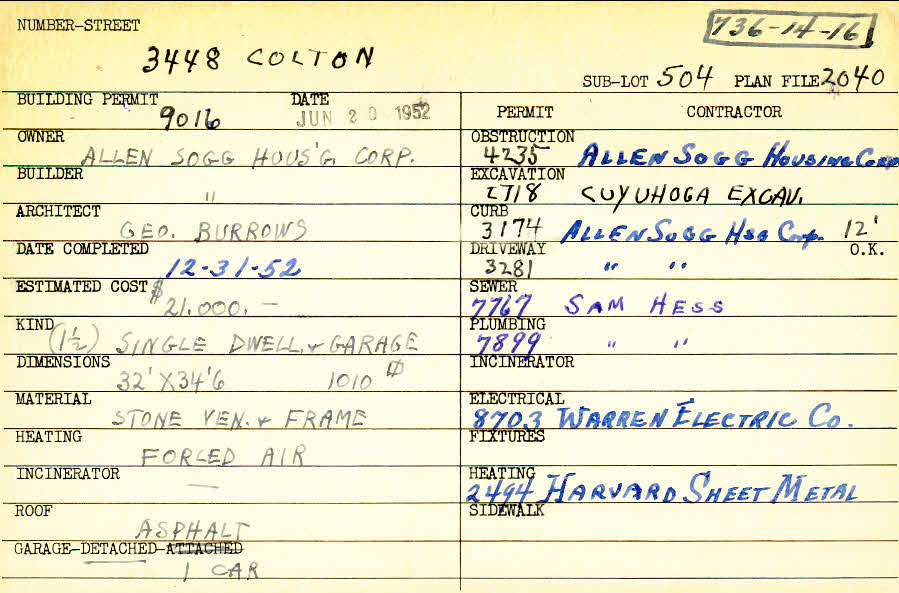 3448 Colton Road Shaker Heights, OH 44122 PARCEL ID: 736-14-016 Building Permit Date: 06-20-1952 Plan File Number: 2040, 3449, 4095 Microfilm Roll: Roll#31, Roll#51, Roll#59 Neighborhood: Mercer Owner: Allen Sogg Housing Corporation Builder: Allen Sogg Housing Corporation Architect: Burrows, George Estimated Cost: 21000 Date Completed: 12-31-1952 Kind: Single Dwelling and Garage Material: Stone Veneer and Frame Heating: Forced Air Roof: Asphalt Garage: detached |